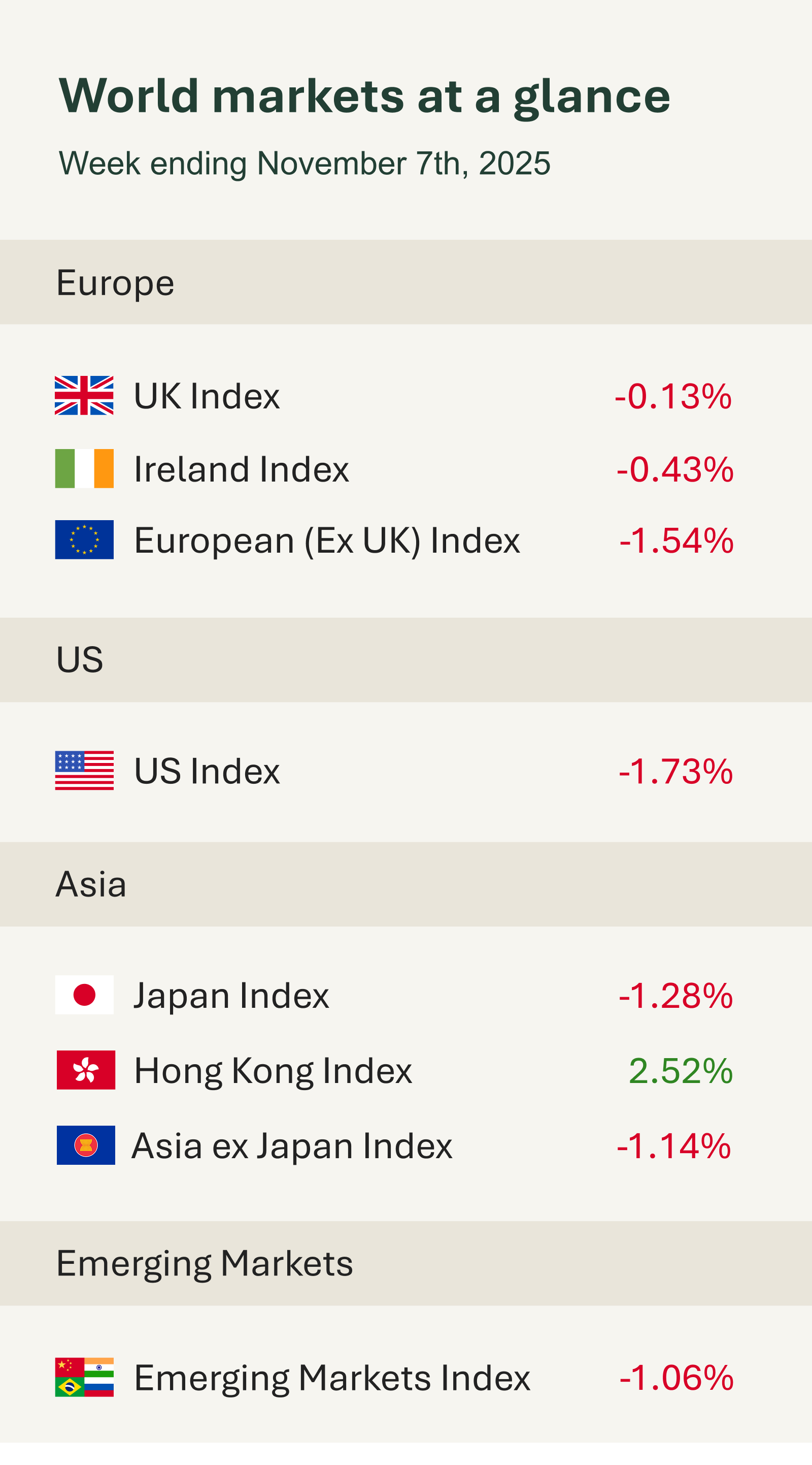As you can see from the accompanying table, global equity markets experienced a softer week, with most major indices heading toward modest losses. Market sentiment was unsettled early in the week by renewed discussion around technology valuations and lingering uncertainty over the government shutdown in Washington. Investors also monitored developments at the U.S. Supreme Court, where justices appeared sceptical about the legality of prior trade tariffs, a ruling that could lead to tariff relief and improved trade dynamics.