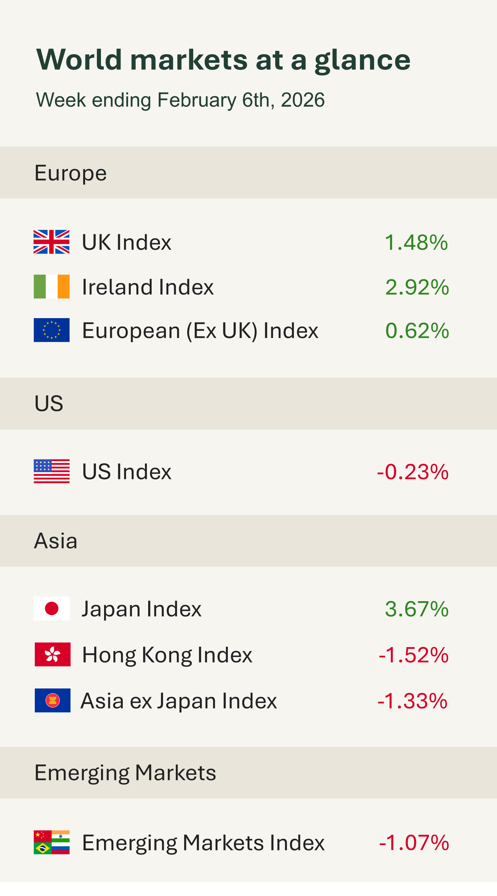 Technology stocks were a key source of market weakness earlier in the week. Concerns around the disruptive potential of artificial intelligence, alongside questions about whether current investment levels can be justified by future profitability, weighed on sentiment. Even as companies delivered robust earnings, Big Tech’s aggressive AI spending plans present a challenge for investors. While Friday’s rebound helped stabilise near-term sentiment. The Dow Jones Industrial Average rose 2.47%, while the S&P 500 and Nasdaq Composite gained 1.97% and 2.18%, respectively. Despite this late-week rally, overall weekly performance remained mixed, with the S&P 500 edging down 0.1% and the Nasdaq declining 1.8%.